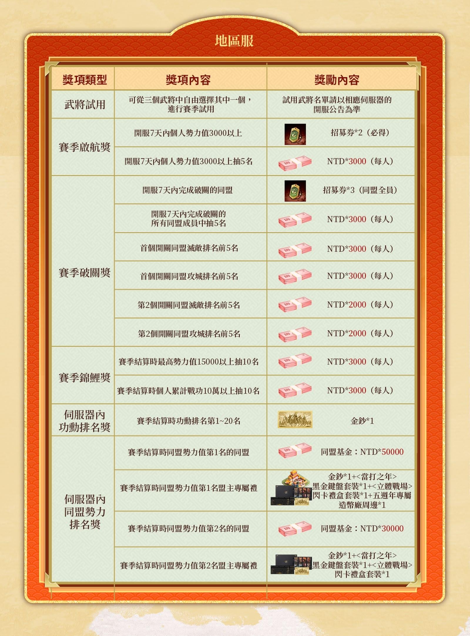 所有進入打金服的主公,均可享有賽季限定武將的試用權,從三位特色武將中任選其一,助力賽季征程。開服七日內,個人勢力值達標即可獲得招募券,並有機會抽取三千元台幣現金獎。同盟在七日內成功破關,全體成員均可獲得招募券獎勵,同時同盟內的攻堅猛將也有機會獲得額外現金褒獎。至賽季結算時,依據個人功勳排名和同盟勢力值排名,將頒發包括限定金鈔、最高五萬元台幣的同盟獎金、五週年專屬黑金鍵盤套裝、閃卡禮盒及造幣廠周邊在內的終極大獎。無論是四海服還是地區服,都設立了極具吸引力的排名獎項,等待強者問鼎。
