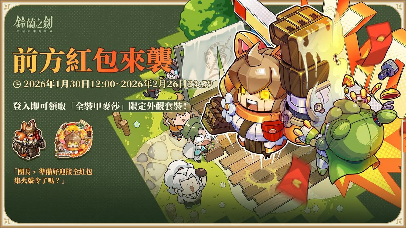 「團長,準備好迎接全紅包集火號令了嗎?」為迎接即將到來的春節,官方特別準備人氣角色「全裝甲麥莎」限定外觀套裝。活動期間內,玩家只要登入遊戲即可獲得,讓麥莎陪伴團長一同迎接嶄新的一年。
