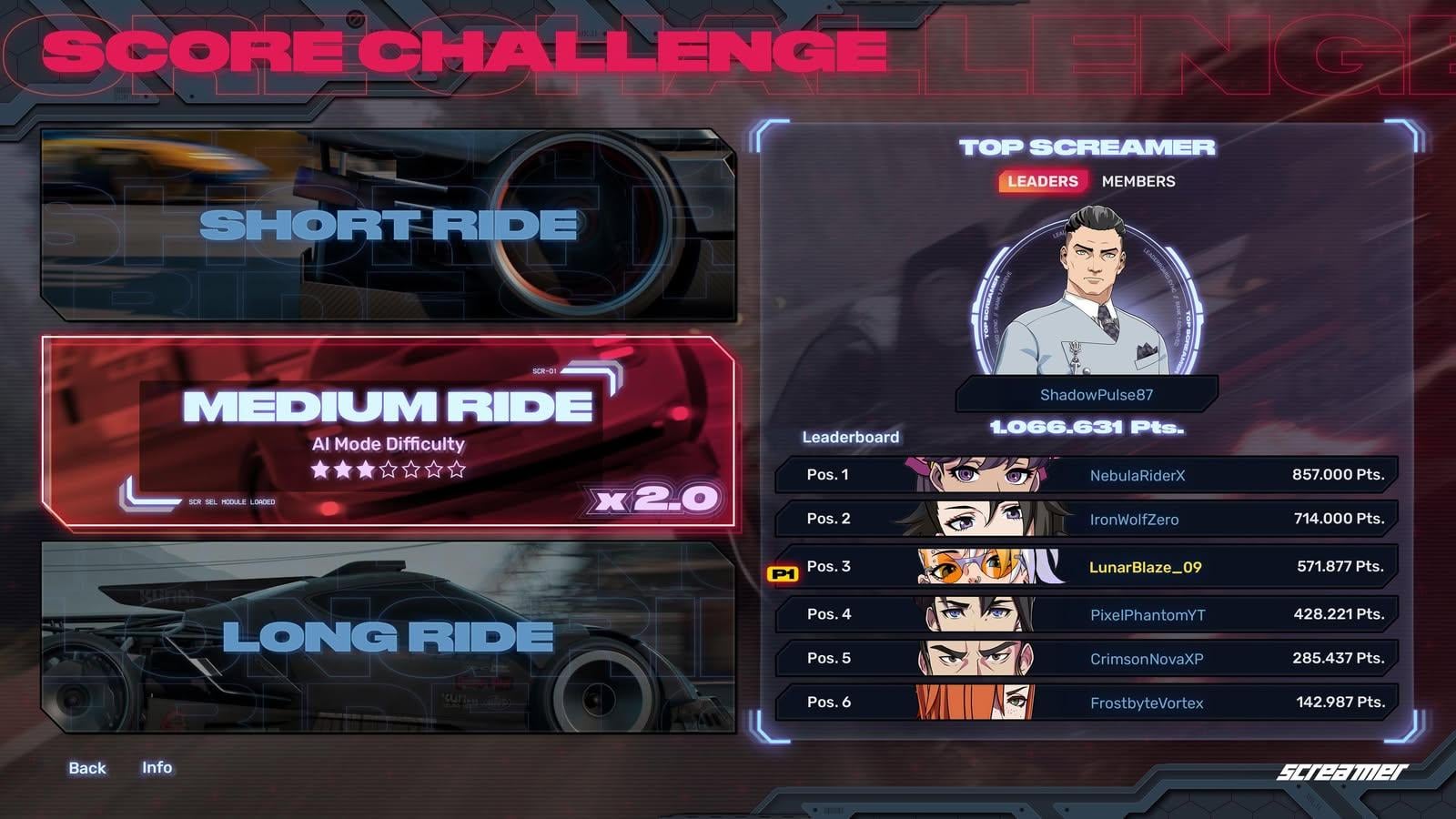 受到經典街機體驗啟發,“得分挑戰”(Score Challenge)是一種基於連續賽事的模式,要求玩家透過一系列比賽完成特定動作來累積盡可能多的分數,爭奪排行榜的頂端位置。作為向街機黃金時代的致敬,《Screamer》還重現了經典街機賽車的挑戰,圍繞精準的過彎路線與無情的速度展開。“計時挑戰”(Time Attack)測試玩家在三圈高強度比賽中的表現,而“檢查點模式”(Checkpoint Mode)則帶來無盡壓力,每一秒都是生存的戰鬥。在“競速模式”(Race Mode)中,玩家可以完全掌控比賽的每個細節,自由調整規則與設定,為遊戲提供最大的自由度與深度定制體驗。
