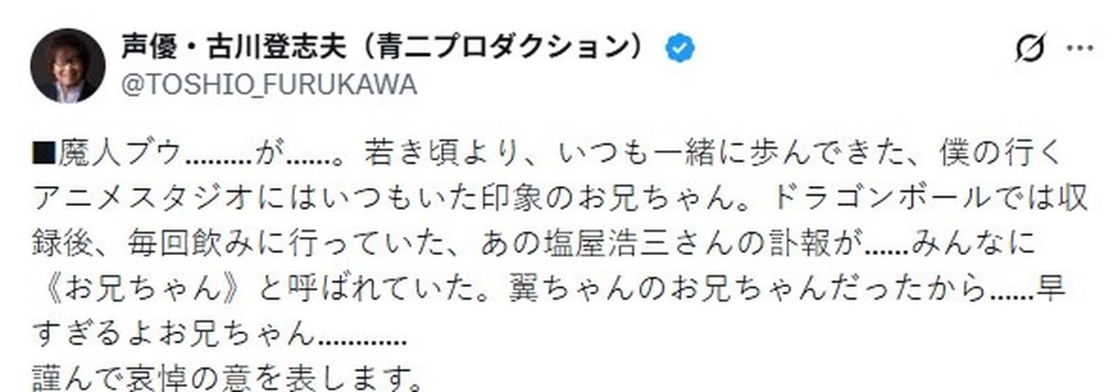 曾為《七龍珠Z》及《七龍珠》系列遊戲中魔人佈歐配音的日本資深聲優 鹽屋浩三 已於1月20日去世,享年71歲。其經紀公司青二製作公司於週三正式公布消息,指出鹽屋浩三因腦出血離世。
