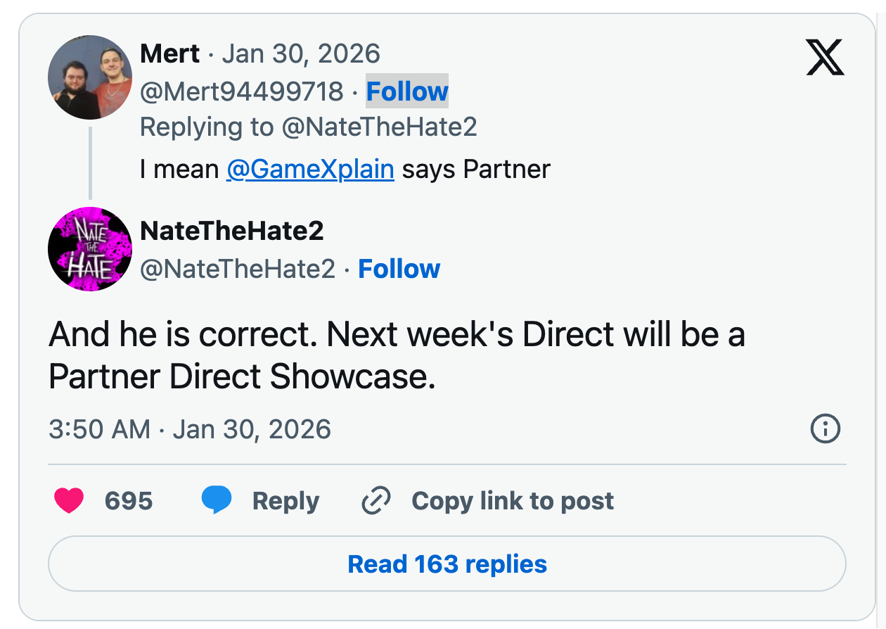該名爆料者透露,這場 Nintendo Direct 預計於 2 月初播出,形式將為「Partner Showcase」,內容重點放在第三方開發商的最新作品資訊,而非任天堂第一方的 Switch 2 獨佔遊戲。