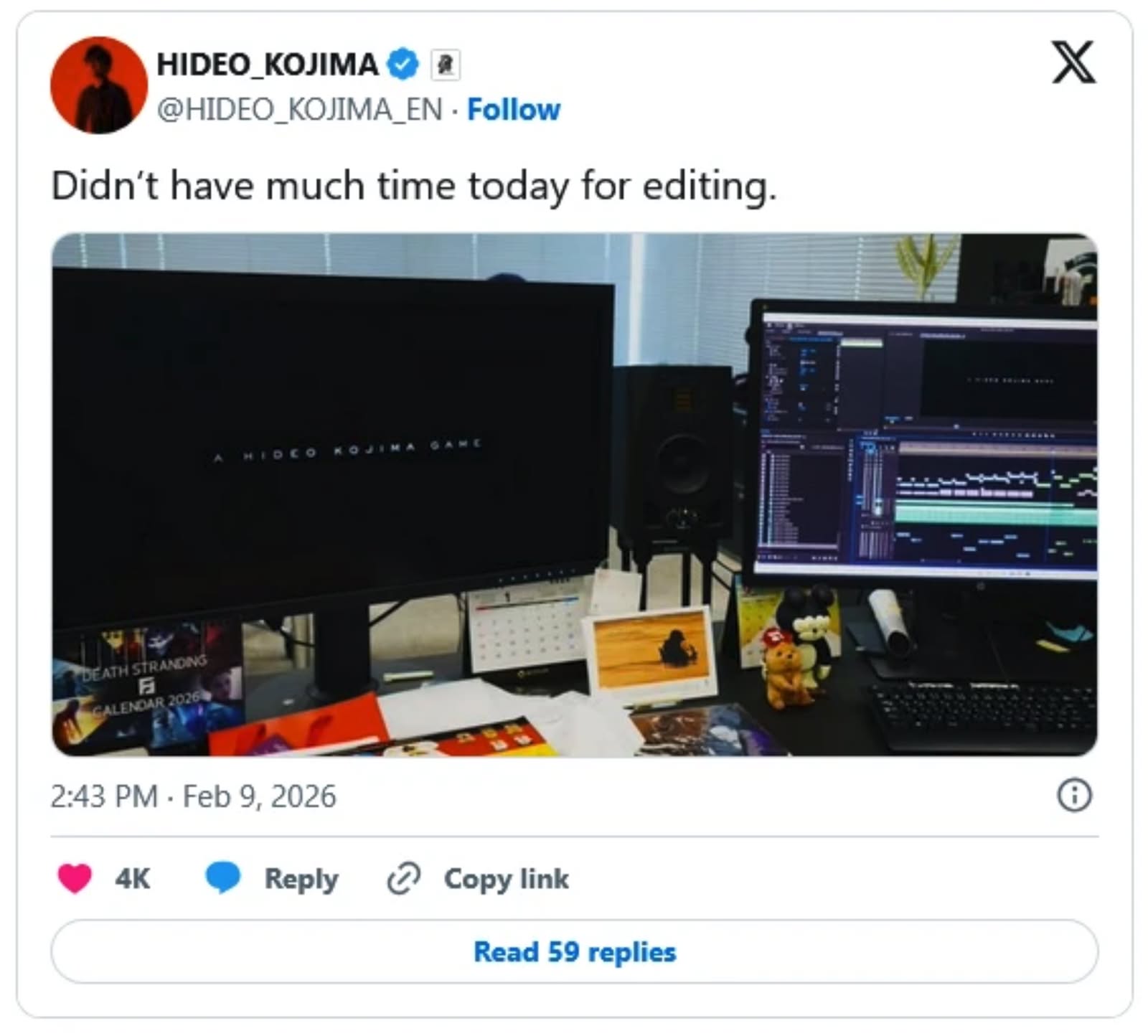 小島秀夫於 2 月 9 日在 X(前稱 Twitter)發文表示「今天剪接時間不多」,而在前一星期,他亦曾發出近似內容,寫道「第一次剪接是……8 個月以來?」。