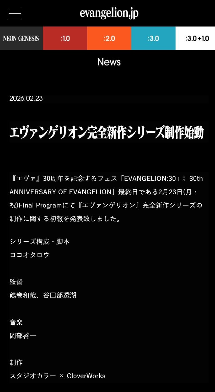 官方消息指出,相關情報於紀念《新世紀福音戰士》30周年的慶典活動「EVANGELION:30+;30th ANNIVERSARY OF EVANGELION」最終日(2月23日)Final Program中首次公開,正式宣佈《新世紀福音戰士》完全新作系列製作決定。