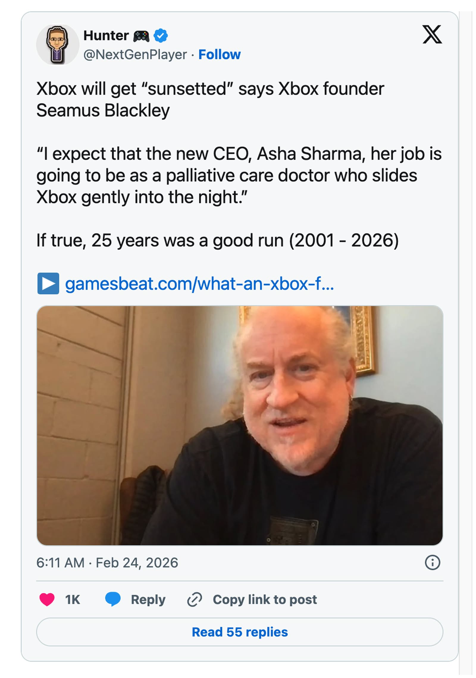 他形容,Xbox目前正被「日落化」,雖然公司未有公開承認,但實際方向已相當明顯。Blackley更直言,新任CEO的角色猶如「紓緩治療醫生」,負責讓Xbox品牌慢慢退場。