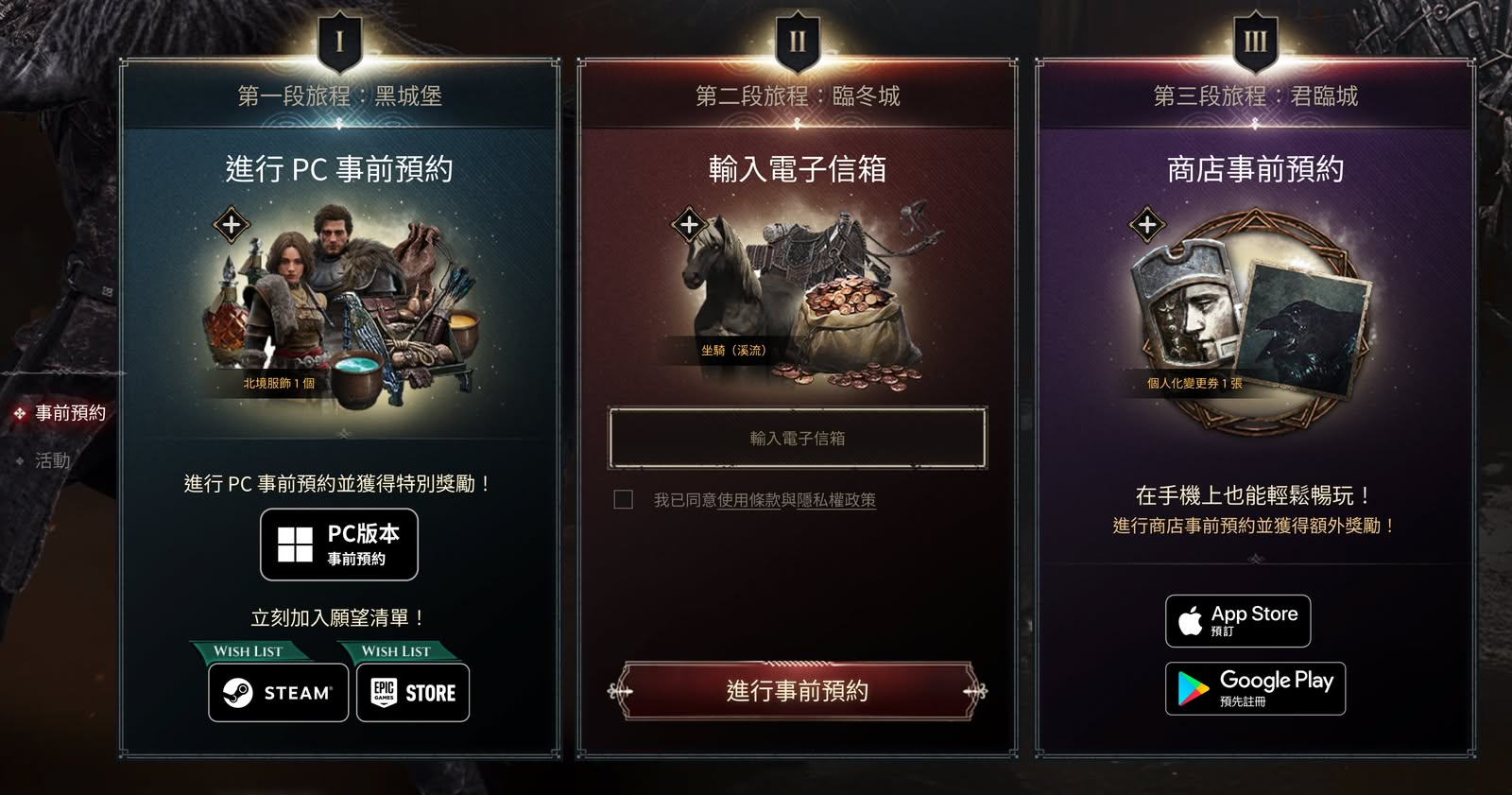 完成事前預約的玩家將可獲得平台專屬獎勵,以支援初期成長與自訂角色。這些獎勵將依不同平台有所差異,並配合以操作為核心的戰鬥機制與職業制玩法設計,讓玩家在遊戲上市時,能以更多優勢展開在維斯特洛大陸的旅程。