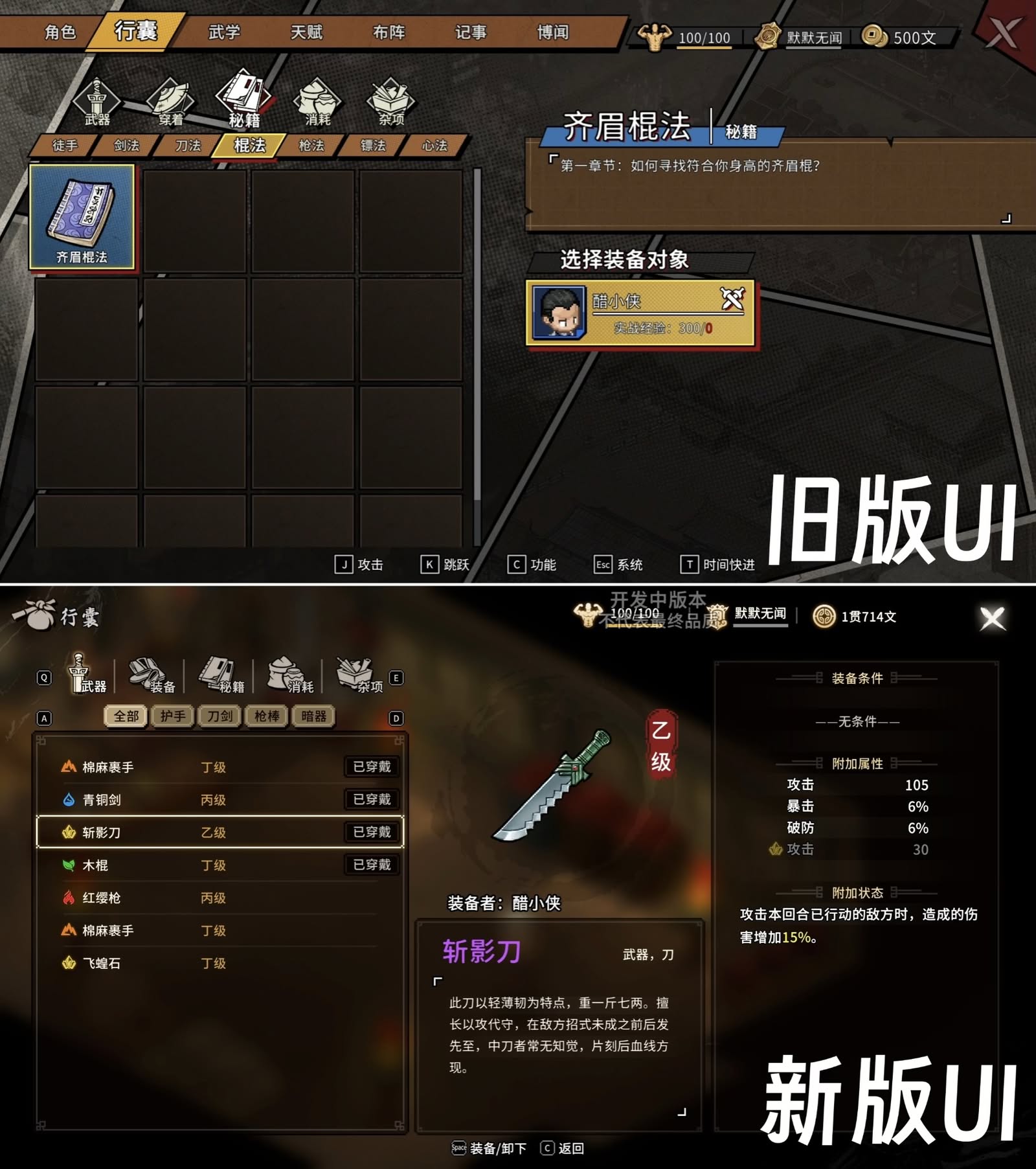 相較首次公布時的版本,Demo 已在多方面進行持續調整。針對此前玩家較為集中的 UI 風格回饋,新版介面重新採用更貼近系列風格的設計方案,同時簡化布局與功能。例如行囊介面新增二級分類與「全部」標籤,使資訊呈現更加直觀;角色狀態提示則移動至左下角,以減少對遊戲畫面的干擾等。