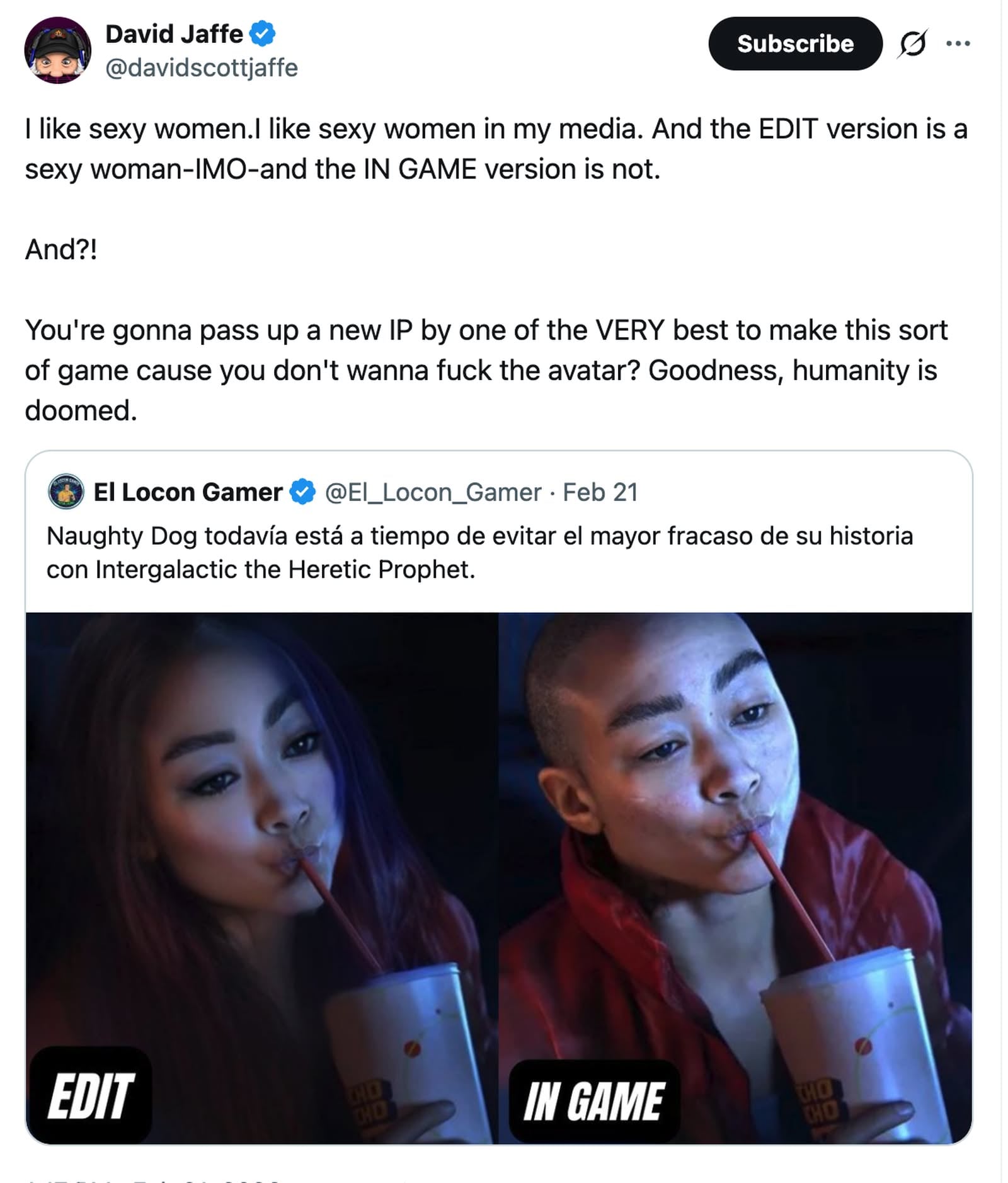 由 Naughty Dog 開發的全新作品《星際:異端先知》尚未推出,已在網上掀起激烈討論。事件起因是一名網民於社交平台發文,聲稱工作室「仍有時間避免史上最大失敗」,並附上遊戲女主角原版與經修改後的對比圖片,暗示若調整角色外觀或可改變作品前景。