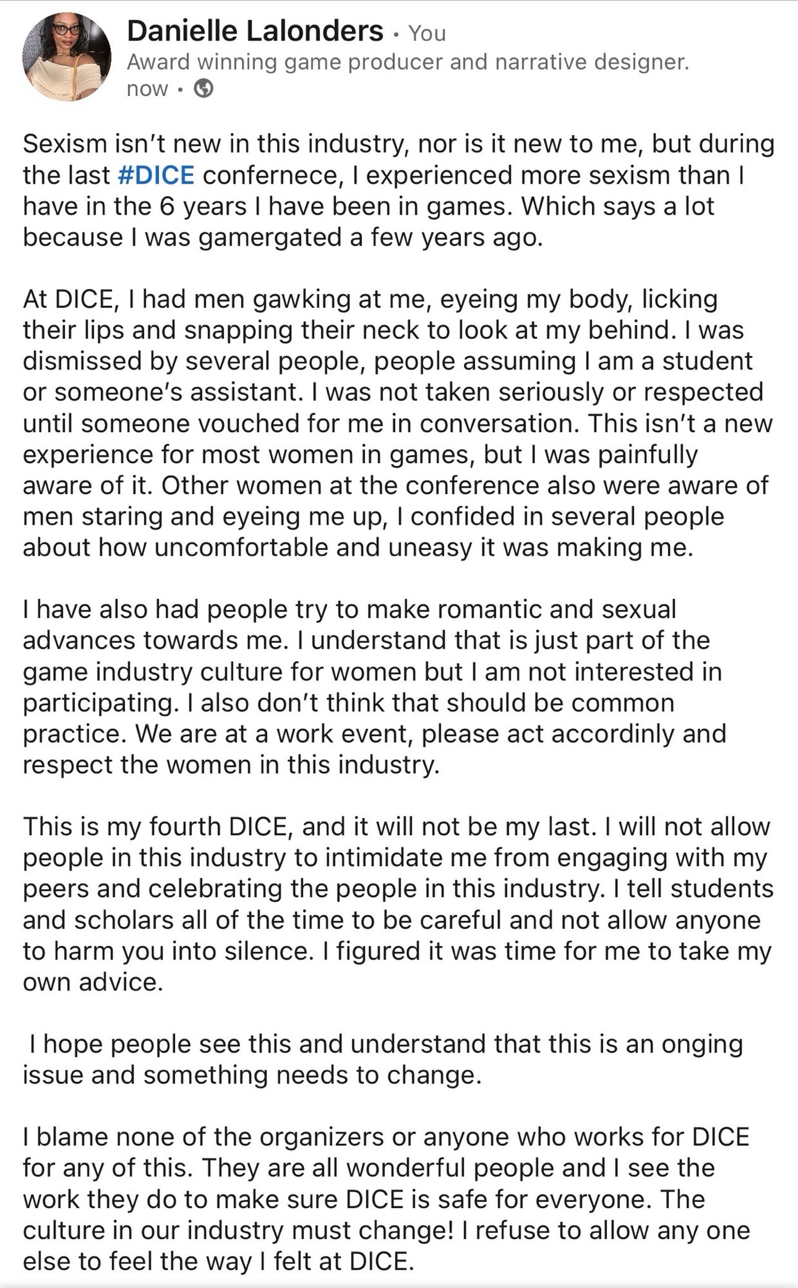 DICE 2026 於 2 月 10 日至 12 日在 Aria 度假酒店舉行。Dani Lalonders 在 LinkedIn 發文表示,性別歧視在遊戲行業並非新鮮事,自己亦曾面對相關問題,但她強調,這次在 DICE 會議上的遭遇,比她從事遊戲行業六年來所經歷的總和還要多。