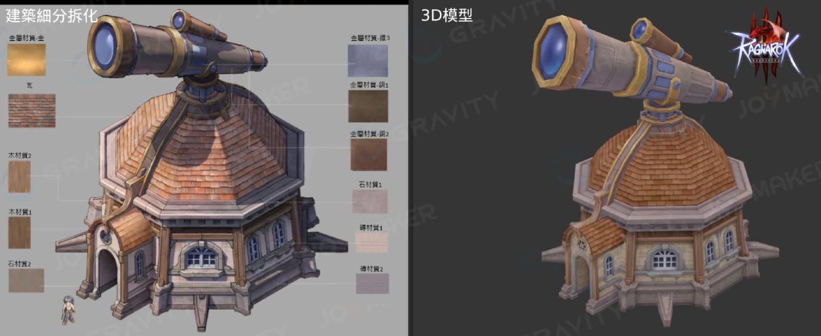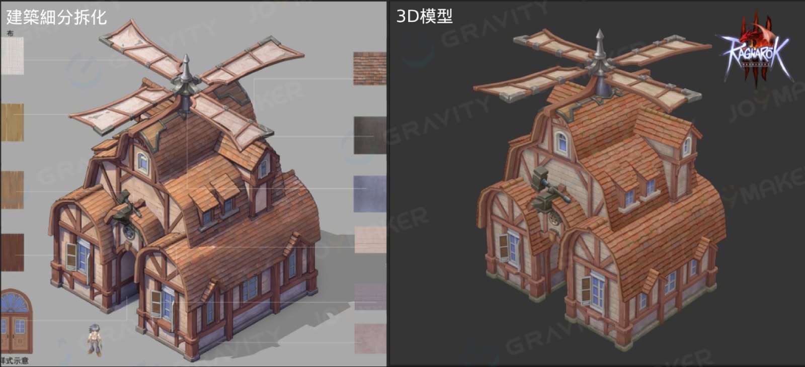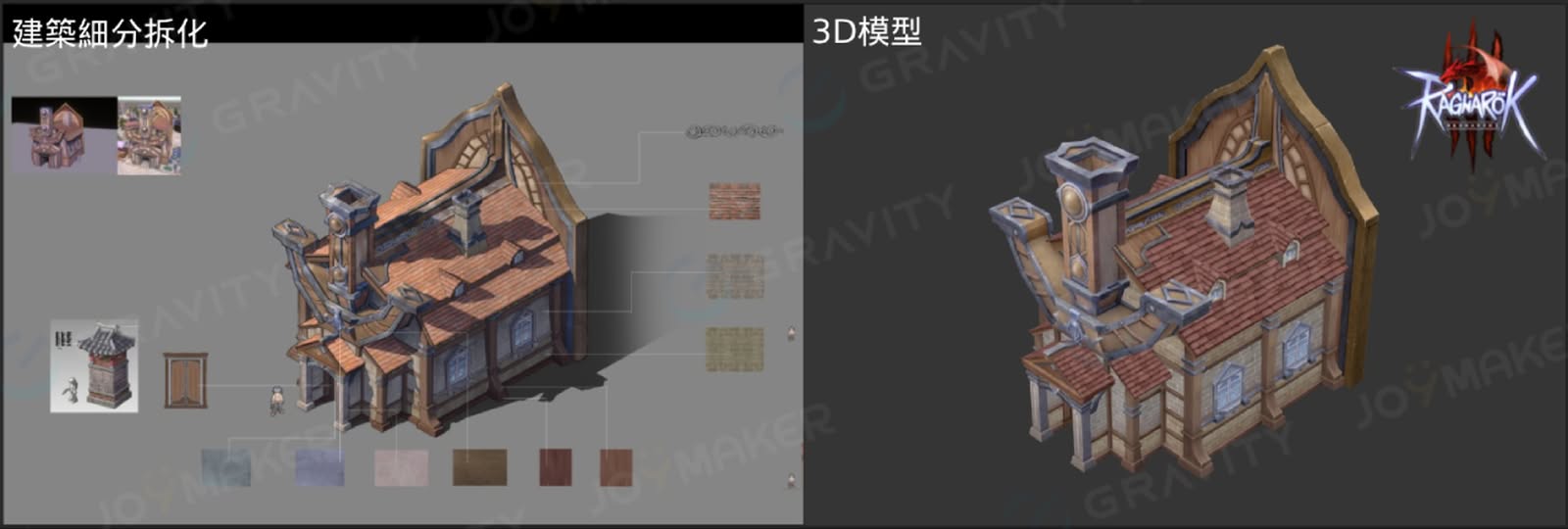 《RO仙境傳說 3》在延續經典風格的同時,進一步將濃厚的北歐神話元素融入可愛的童話風格與現代像素表現,打造出獨具特色的「新復古」視覺。場景與建築嚴格遵循《RO仙境傳說》的設定比例,3D模型也細緻保留手繪繪本般的質感,透過屋瓦、窗框與牆面等細節層層堆疊,重現北歐神話世界的神秘感與宏大氣勢。設定圖中也特別加強了承襲神話底蘊的細節描寫。