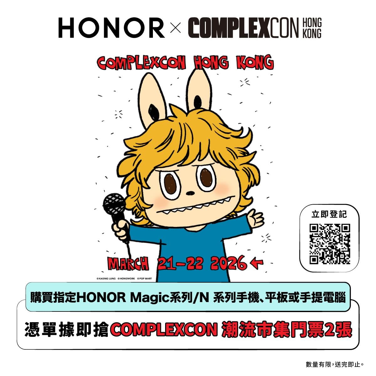除了會場內的攝影體驗外,HONOR 亦宣佈推出門票贈送活動。由 3 月 12 日 起,消費者只要於 HONOR 官方產品銷售點以正價購買任何 HONOR Magic 系列/N 系列手機、平板或手提電腦,並憑收據登記,即有機會獲贈 ComplexCon 潮流市集門票 2 張。