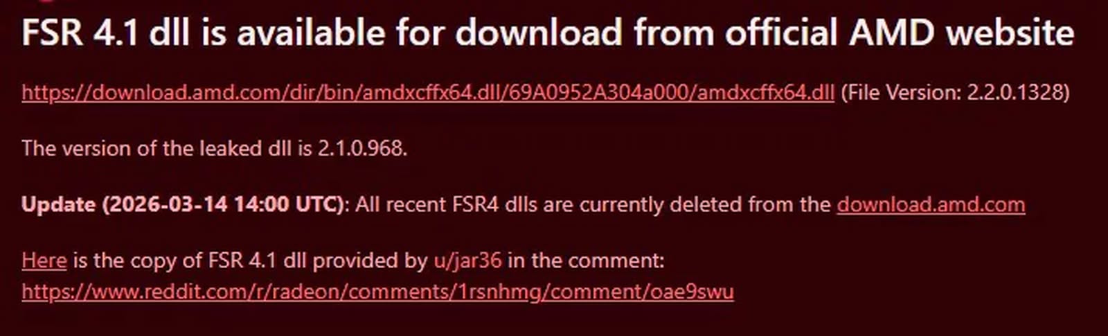 根據網上流傳消息,這次被發現的檔案來自 AMD 官方網站,有 Reddit 用戶指出相關 DLL 曾可直接下載,其後又被移除。現階段 AMD 未有就此作出正式說明,因此版本名稱、功能內容,以及最終推出時間仍未獲官方確認。