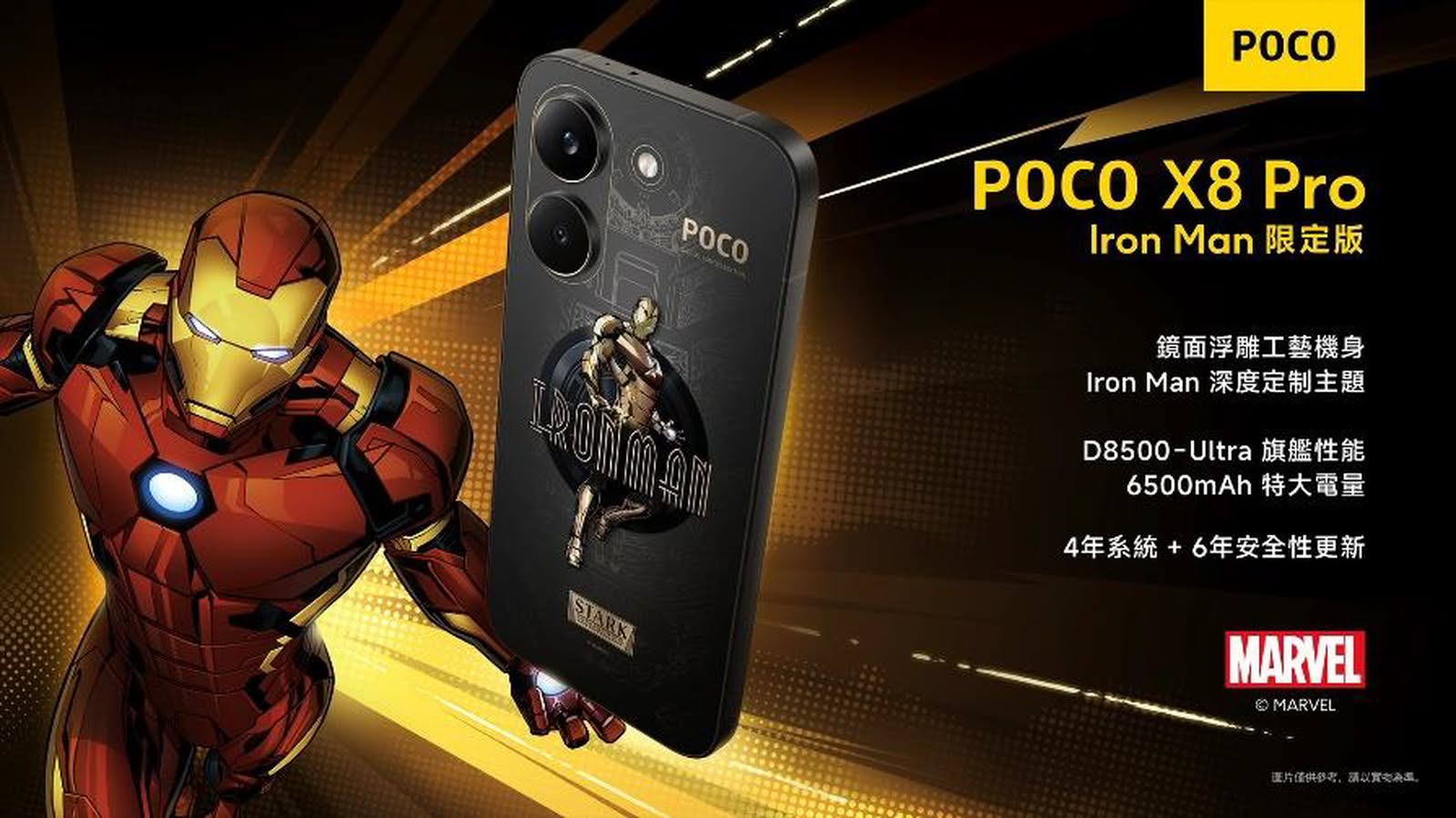 POCO 再度深化與 Marvel 的合作,結合先進科技與大膽設計,推出 POCO X8 Pro Iron Man限定版,以矚目新形態回歸,帶來無與倫比的性能。這款最新特別版建基於 POCO 大膽無畏的品牌基因及其不斷突破界限的驅動力,標誌著一次全新演進——正如這套次世代金色裝甲般,變得更強大、更銳利。