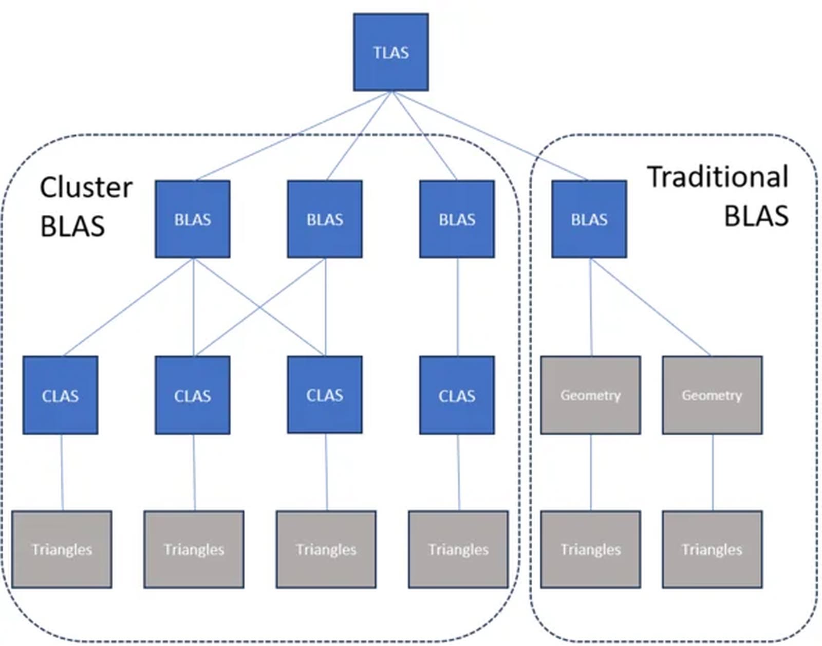 據 Microsoft 介紹,clustered geometry 主要針對三角形這類 3D 圖像的基本構成單位作出優化。新規格會把鄰近的三角形群組整合成單一簡化單位,讓 GPU 可以更有效率地批量實例化及移動幾何拓撲,簡化以往需要對場景中大量三角形逐一呼叫的流程。這種新方式亦可減少更新或重複現有幾何資料的需要,預料能改善樹葉、群眾或其他場景物件的光線追蹤效能表現。