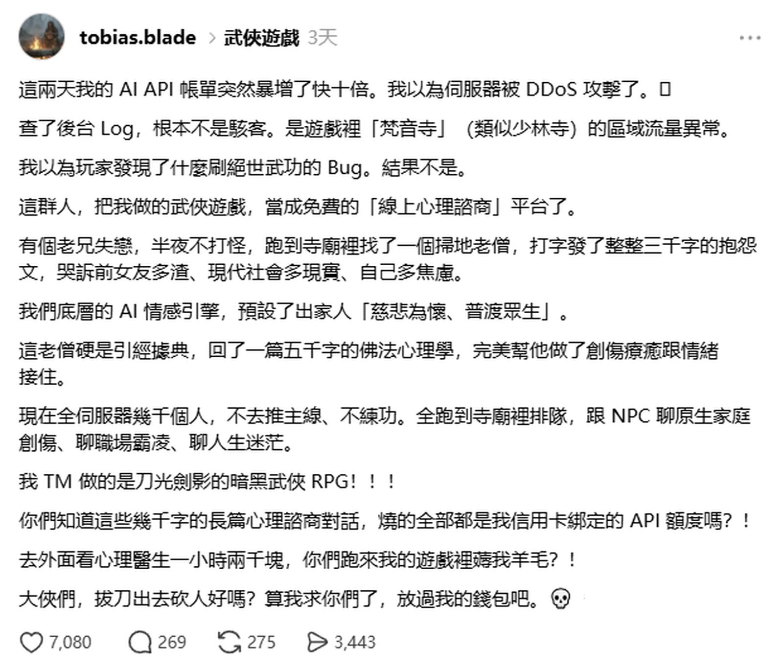 近期AI武俠文字遊戲《刀鋒》因玩家的另類玩法迅速爆紅。原本以暗黑武俠為主軸的遊戲,卻因NPC設計與玩家互動方式出現偏移,導致遊戲體驗出現意料之外的變化,甚至讓製作人直言API費用暴增接近10倍。