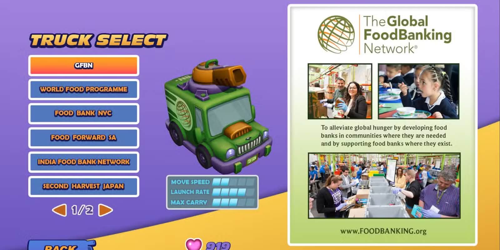 《Food Drive: Race Against Hunger》是一款街機風格駕駛遊戲,玩家將操作一架可自訂外觀的餐車,在城鎮中穿梭收集包裹,並將食物送到有需要的人手上。每局遊戲時間為四分鐘,玩家需要在有限時間內盡可能完成更多送遞任務。
