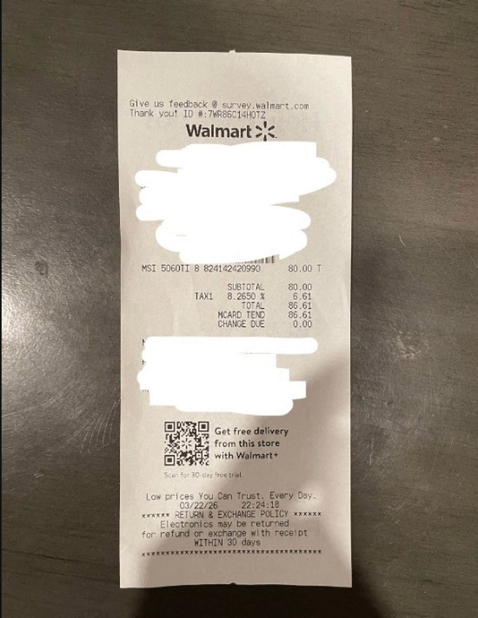 該用戶 ForkDryer 表示,他在逛當地沃爾瑪時發現這張顯示卡,雖然價格看起來不太真實,但最終在收銀時仍成功以標籤價完成交易。他亦提到,目前使用的顯示卡仍是 GTX 1060 6GB。