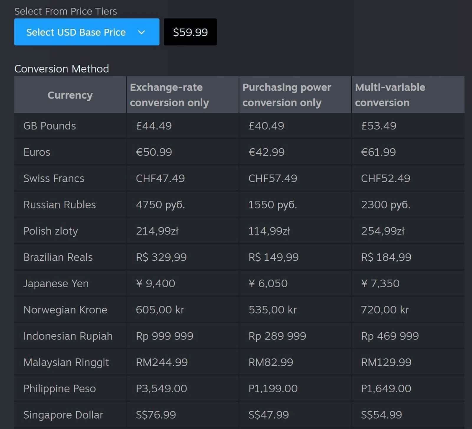 Valve近日更新旗下數碼平台Steam的區域價格建議系統,讓開發者在設定不同地區遊戲售價時擁有更大彈性。過去平台僅提供單一的美元轉換方案,將價格直接換算成各地貨幣。而在新機制下,開發者可從三種不同方式中選擇,包括依照即時匯率計算、根據當地玩家購買力調整價格,以及結合兩者的混合模式。該混合方案與舊系統相似,但會參考更即時的經濟數據。
