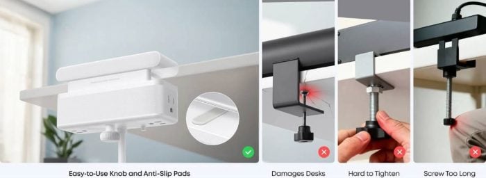 設計上,這款產品透過可調式夾具固定在桌面,上下兩部分可利用內建旋鈕夾緊桌板。Anker 表示,這種結構可讓產品穩固固定,用戶即使用單手插拔裝置時,機身亦不容易移動。官方指出,產品適用於厚度 0.6 至 1.8 吋(約 12 至 45 mm)的桌面,機身尺寸為 6.02 x 2.06 x 3.97 吋153 x 52.2 x 100.85 mm)。