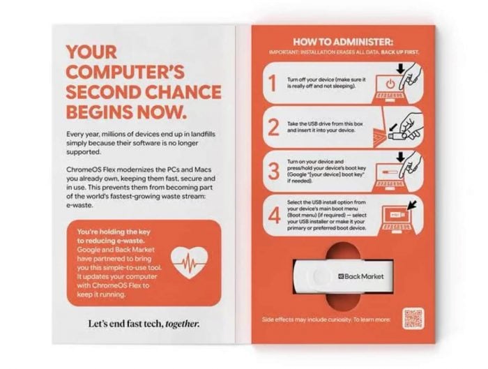 實際上,這是一支預先安裝 ChromeOS Flex 的 16GB USB 手指。用戶將裝置插入筆電後,可以選擇直接把 ChromeOS Flex 安裝到電腦之中,亦可以直接透過 USB 開機執行系統,毋須清除原有資料。消息指出,整個安裝過程少於 5 分鐘。