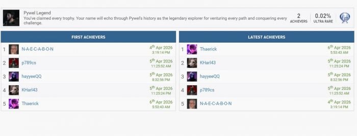 截至目前為止,PlayStation 平台僅有5名玩家達成100%完成度,而每一位玩家的遊玩時間均接近300小時。換言之,若希望在兩週內取得這項極為稀有的白金獎盃,玩家每日需投入至少20小時遊玩。