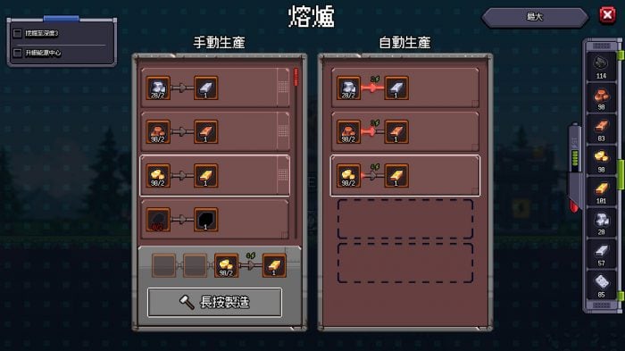 《地心工業線》的核心賣點在於玩家不需要複雜的管線建設與管理,就可以搭建出一套生產矩陣。建造熔爐、精煉機、組裝機、加工機等生產複雜的科技組件。隨著工廠等級提升,自動生產槽位將不斷解鎖,確保即便玩家深處地底,工廠仍能24小時不間斷運轉。