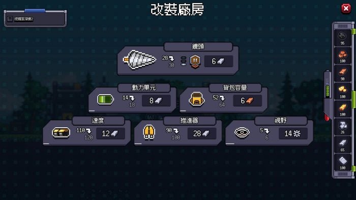 • 機器人自定義強化:在「改裝車間」升級奇普的鑽頭、動力單元、噴射背包及背包容量,將自己武裝成地球史上最強大的採礦機器。