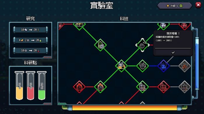 在**「實驗室」(Laboratory)**中,玩家可以消耗研發點數來解鎖「改變遊戲規則」的尖端技術,讓遊戲體驗產生質變。例如「太陽能助力」與「自動充電」技術,讓奇普返回地面時即可瞬間補滿能量,徹底告別手動操作,或者解鎖「三倍」甚至「五倍」挖掘範圍,一鍵清空大片礦區。