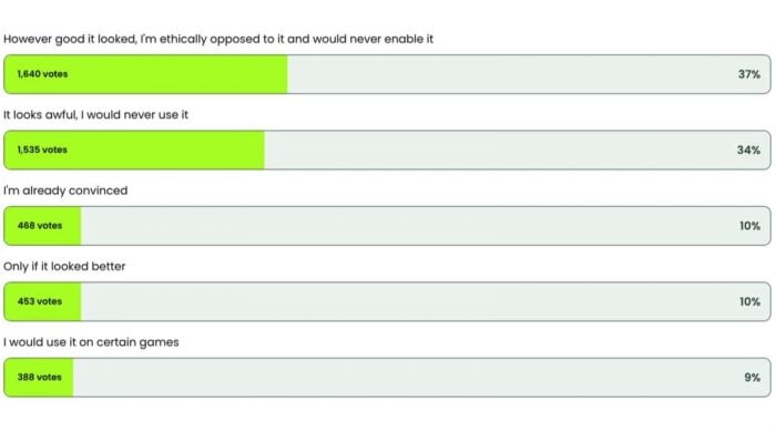 不過仍有少數玩家持開放態度。調查顯示,約10%玩家表示已被說服,會在今年秋季功能推出後立即啟用;另有9%表示只會在特定遊戲中使用;剩餘10%則認為,若最終畫面效果優於目前展示中帶有「AI生成感」的版本,仍會考慮開啟。