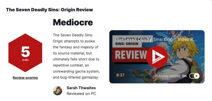 不過,IGN 在評語中認為,《七大罪:起源》雖然試圖重現原作作品那種奇幻與宏偉感,但整體流程過於冗長,難以持續吸引玩家投入。