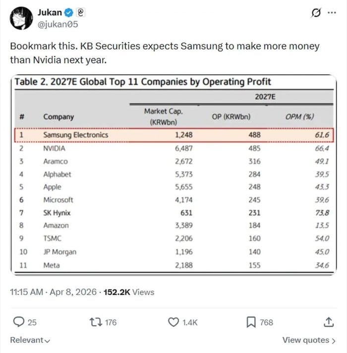 根據報告,KB Securities 預測三星 2026 年營運利潤可達 327 兆韓圜,到 2027 年進一步升至 488 兆韓圜;相比之下,NVIDIA 2027 年營運利潤預測約為 485 兆韓圜,意味三星有機會以些微差距反超。分析師亦指出,現時三星市值僅約為 NVIDIA 的 19%,但盈利增長動能相當強勁。