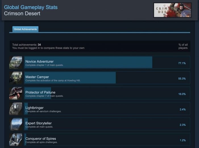 當玩家完成所有主線任務後,便可解鎖名為「Expert Storyteller」的 Steam 成就。不過根據 Steam 數據,目前只有約 2.3% 玩家成功取得這項成就,反映出《赤血沙漠》的主線通關比例相當低。