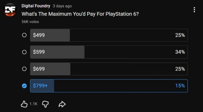 Digital Foundry 近日進行一項關於次世代主機價格的調查,試圖了解玩家對 PlayStation 6(PS6)的接受定價。此次問卷共吸引約5.6萬名用戶參與。
