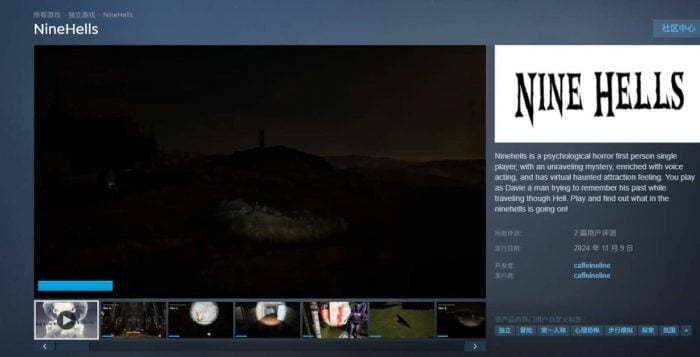《NineHells》是一款第一人稱心理恐怖遊戲,採用線性敘事,並加入神秘調查元素。玩家將扮演主角戴維,穿梭於陰森詭異且充滿象徵意味的地獄各層,嘗試尋回自己失去的記憶。