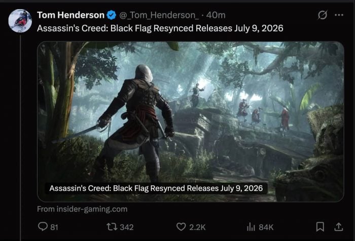 Ubisoft 旗下《刺客教條4:黑旗 Resynced》再有新消息。這款近年屢傳重製的作品,早前已確認存在,最新消息指出遊戲將於 2026 年 7 月 9 日推出,而原定今日公開的正式發表,則已押後至下星期。