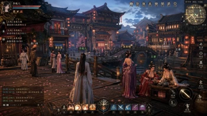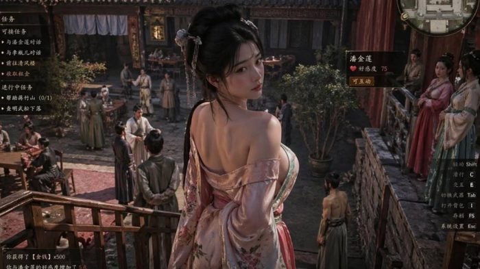 其中一個引起討論的案例,是有網友透過簡單提示詞生成一組以《金瓶梅》為主題的古代ARPG MMO開放世界遊戲畫面。圖像內容包括古典街景、西門慶府等小說場景,並附帶完整遊戲UI及角色配置。整體畫面在光影、細節與風格上呈現出高度擬真效果,與真實遊戲截圖相當接近。