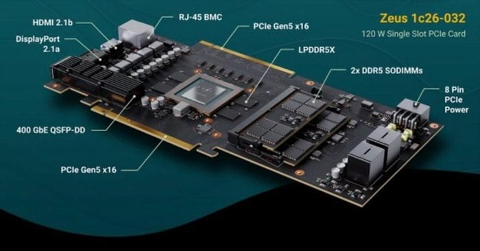 雙芯版本 Zeus 2c26 則為雙槽全長設計,算力提升至雙精度 10 TFLOPs、單精度 20 TFLOPs、半精度 40 TFLOPs,配備 256MB 快取與 64GB 或 128GB LPDDR5X 記憶體,最高可擴展至 320GB 至 384GB,頻寬達 725GB/s,光追性能為每秒 1540 億射線,功耗為 250W。