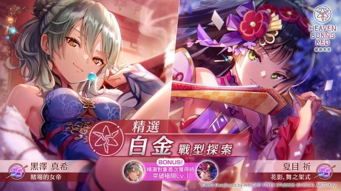 本次的「精選白金戰型探索」中,SS<靈魂共振>[花影,舞之架式]夏目祈、SS<靈魂共振>[賭場的女帝]黑澤真希的新戰術型態,經精選出現機率上升!