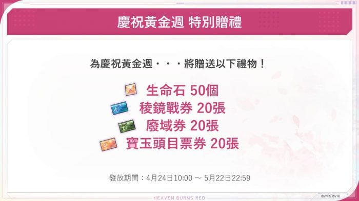 期間內首次登入就致贈生命石×50、稜鏡戰券×20、廢域券×20、寶玉頭目票券×20!