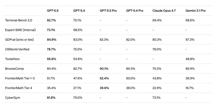 GPT-5.5 據稱適用於智能體程式設計、知識處理、數學運算、科學研究等場景。OpenAI 官方比較結果亦被指顯示,GPT-5.5 綜合評分領先舊版模型,以及 Google Gemini 3.1 Pro、Anthropic Claude Opus 4.5 等競品。