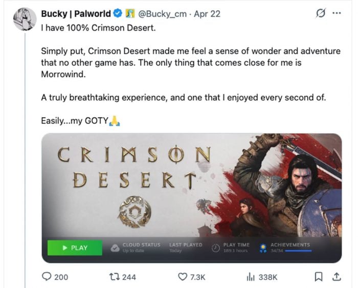 完成這項挑戰的是《幻獸帕魯》社群經理 John「Bucky」Buckley。他於社交平台表示,自己已經100%完成《赤血沙漠》,並指出該作帶來前所未有的驚奇與冒險感。他形容,唯一能與之接近的作品只有《上古卷軸III:晨風》,並直言這是一段令人印象深刻的遊戲體驗,每一刻都相當投入,甚至認為是今年的年度遊戲。