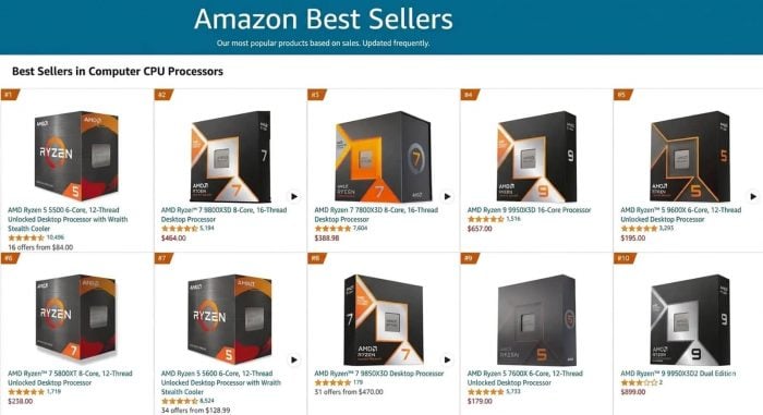榜首方面,預算型 Ryzen 5 5500 仍然保持高人氣。隨著記憶體價格上升,AM4 平台重新受到注目,令這款入門級處理器繼續成為平價砌機選擇之一。至於 Ryzen 7 9800X3D,則憑遊戲效能與價格表現成為不少玩家首選,而 Ryzen 9 9950X3D 亦打入 Amazon 前五名。