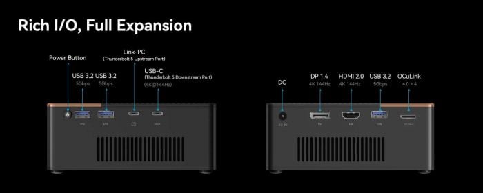 對於未有 OCuLink 的電腦,Morefine G2 亦提供 Thunderbolt 5 連接,並支援 USB4 v2。產品同時設有 Thunderbolt 5 下行連接埠,可提供 4K 144Hz 顯示輸出,另外還包括 3 個 USB 3.2 Gen 1 Type-A、HDMI 2.0 及 DisplayPort 1.4。