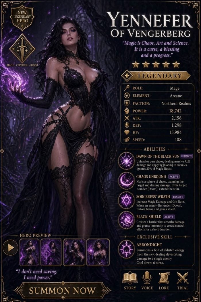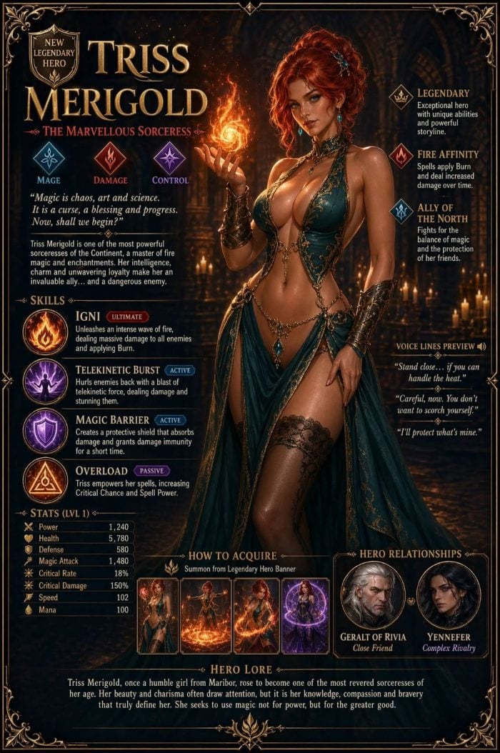從相關圖片可見,角色形象經過風格化處理,並融入 RPG 遊戲元素。畫面中同時加入角色介紹、技能以及狀態等文字資訊,整體呈現類似遊戲 UI 介面的資訊圖表風格。